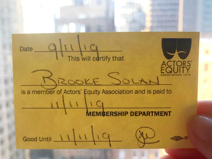 Sep 11, 20191 min readGot Her Equity Card!After concluding her job at Weathervane, Brooke is now a proud member of Actor’s Equity Association. #AEA
